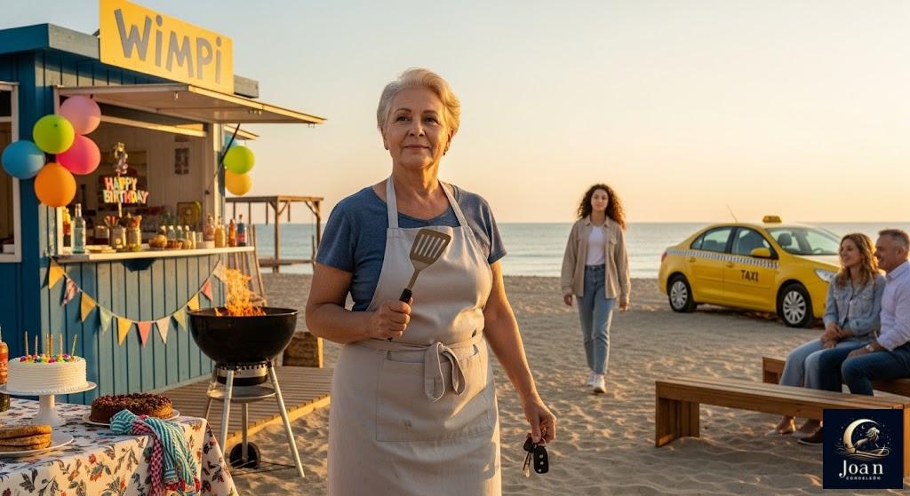 «A warm, poetic illustration of a mature woman standing at a beach at sunset, wearing a chef’s apron tied over a casual outfit, holding a spatula in one hand and car keys in the other. A small beach kiosk named ‘Wimpi’ stands behind her with a sizzling grill, while a yellow taxi waits nearby on the sand. In the distance, a teenage girl walks confidently toward the horizon, watched lovingly by her parents sitting on a bench. Include subtle birthday decorations like balloons tied to the kiosk and a cake on the table. The scene radiates emotion, nostalgia, and quiet strength. Style: semi-realistic with painterly texture, soft lighting, golden-hour atmosphere.»