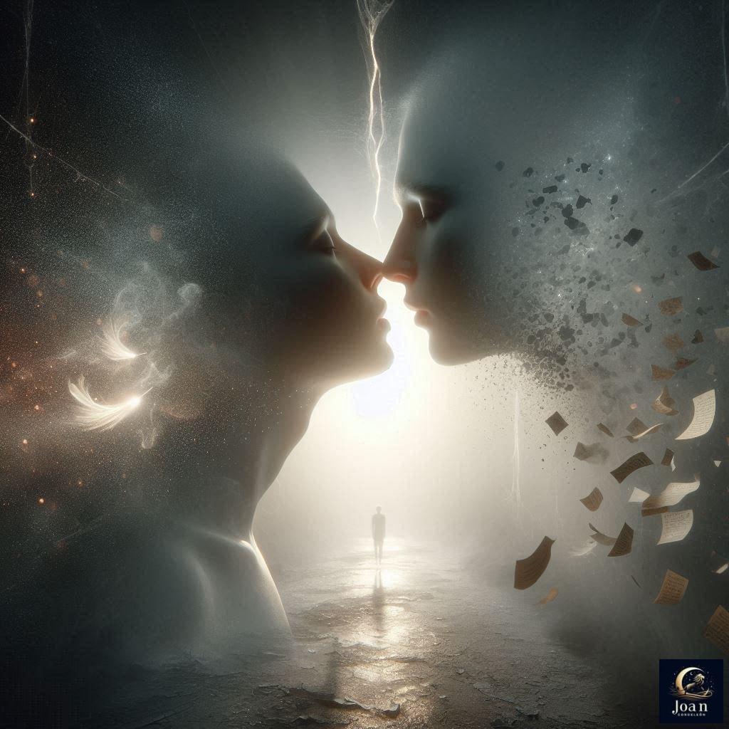 «Una figura andrógina en penumbra, detenida justo antes de un beso, en un espacio entre dos sombras que casi se tocan pero no. El entorno es onírico y desdibujado, con elementos flotantes como letras o cenizas suspendidas en el aire. El fondo muestra una grieta luminosa, como si el mundo se partiera justo donde el deseo es contenido. El ambiente transmite tensión suave, melancolía íntima y una esperanza suspendida, como si el tiempo se hubiera detenido en un suspiro.»