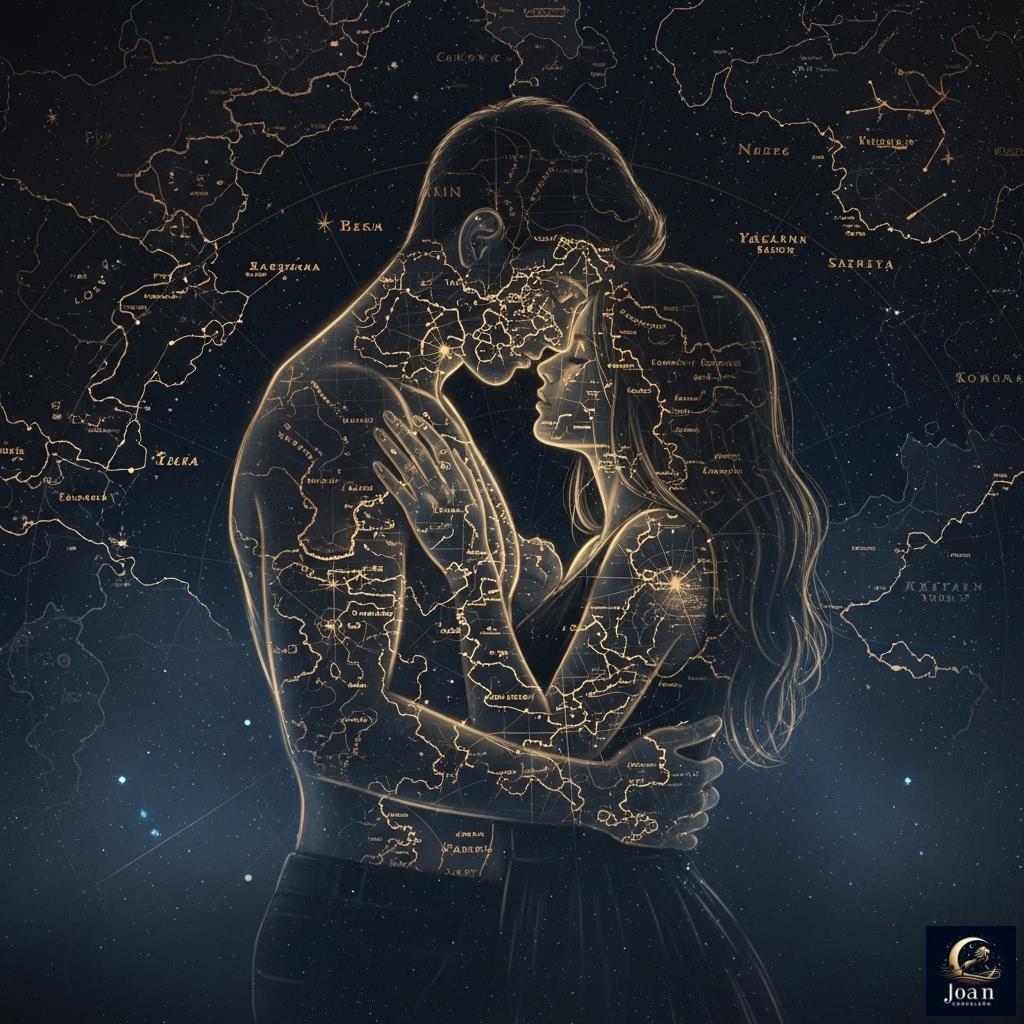 «Un par de figuras entrelazadas, una cartografía difusa trazada sobre sus cuerpos con líneas doradas. Fondo oscuro con destellos como constelaciones. Estilo: arte digital onírico, con texturas suaves y detalles abstractos que recuerdan mapas antiguos y luz tenue de astros.»