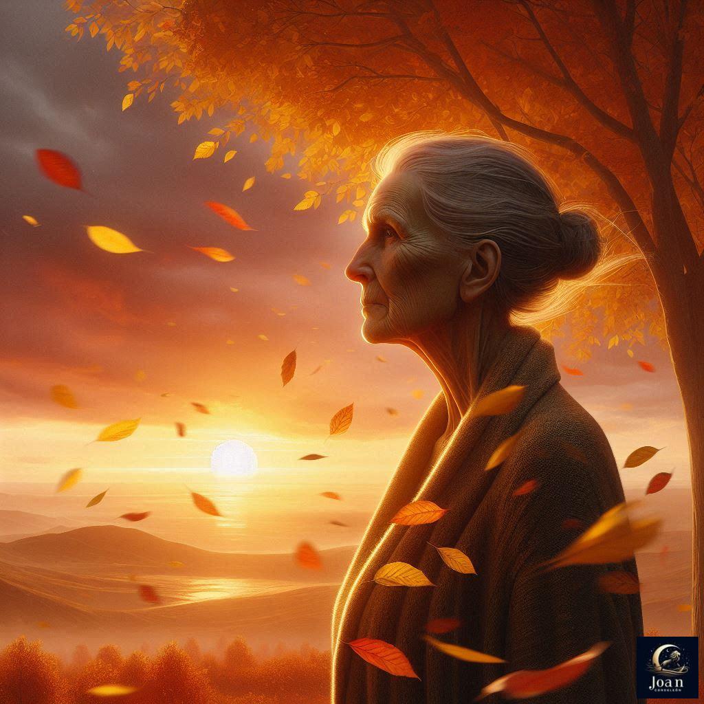 «Ilustra una escena otoñal cargada de simbolismo y emoción. Una figura de género neutro y edad indefinida, de pie bajo un árbol de hojas doradas que caen lentamente. La figura mira hacia el horizonte donde el sol se pone en tonos cálidos de naranja, rojo y dorado. En su expresión se mezcla la nostalgia y la esperanza. El viento arrastra las hojas como si fueran recuerdos. Al fondo, un paisaje sereno que transmita la idea de los últimos años de la vida, pero con un destello de renacer. La atmósfera debe combinar melancolía, desolación y una vibrante esperanza.»