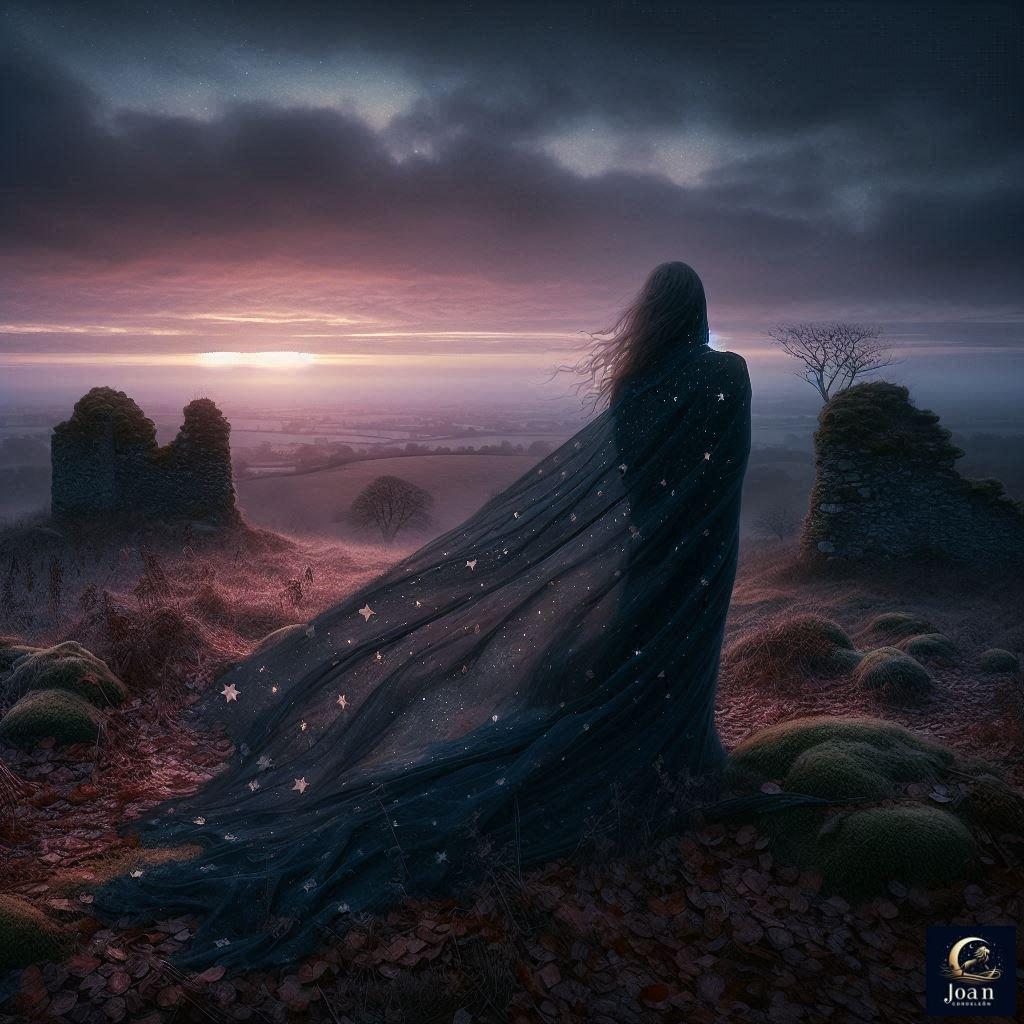 «Un paisaje onírico al amanecer: una figura andrógina envuelta en una capa de estrellas observa el horizonte desde una colina solitaria. El cielo está teñido de tonos malva y azul profundo, y un viento suave mueve hojas secas en el suelo. A su alrededor, ruinas cubiertas de musgo brillan con una tenue luz dorada, simbolizando un amor que persiste. La atmósfera es melancólica pero impregnada de una luz cálida que sugiere esperanza.»