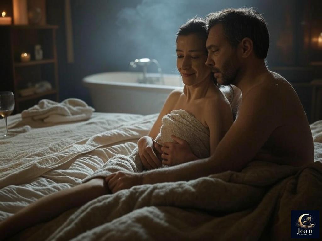 «Una escena íntima y cálida en una habitación bañada por luz tenue, con una bañera humeante al fondo y una cama desordenada en primer plano. Una figura envuelta en una toalla se recuesta en los brazos de otra persona que la sostiene con cuidado y ternura. El ambiente transmite serenidad, confianza y conexión emocional profunda, más allá del deseo físico. Vapor suave en el aire, velas encendidas y detalles como una copa de vino o una toalla mojada ayudan a completar la atmósfera.»