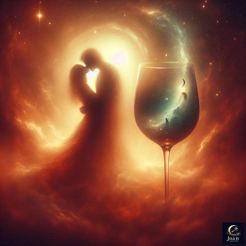 «Una escena íntima y etérea en la que dos siluetas comparten un beso bajo una luz cálida y difusa, como si el tiempo se hubiera detenido. Una copa de vino medio vacía reposa cerca, reflejando estrellas como si el universo estuviera contenido en ella. El fondo debe ser onírico, como si flotaran en un rincón suspendido del tiempo, con tonos dorados, rojizos y un leve resplandor que sugiere eternidad.»