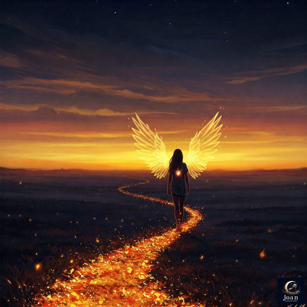 Una figura caminando sola en un sendero iluminado por brasas encendidas en el suelo, como si el camino estuviera formado por pequeñas llamas que no queman. Alrededor hay un paisaje oscuro, pero el horizonte muestra una luz cálida al fondo, simbolizando esperanza. La figura camina erguida, en paz, sin mirar atrás. El estilo debe transmitir libertad, renacimiento interior y dignidad serena. Añadir un efecto etéreo o simbólico de alas o fuego en el corazón que no destruya, sino ilumine.