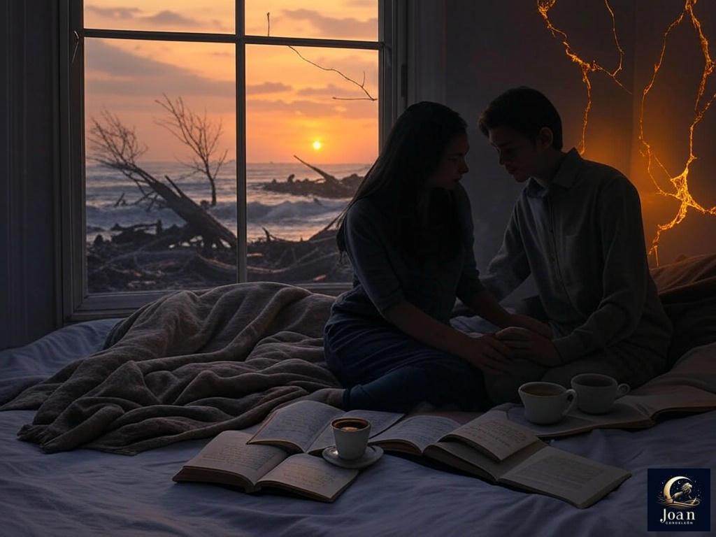 «Una escena íntima en una habitación semi oscura, con luz suave entrando por una ventana al atardecer. Dos figuras de género ambiguo están sentadas juntas en el suelo, rodeadas de libros abiertos, una manta vieja y tazas de té humeante. Una de las figuras sostiene la mano de la otra con ternura. Al fondo, el mundo parece derrumbarse tras la ventana (paisaje roto, árboles doblados por el viento), pero en la habitación todo está en calma. La atmósfera es melancólica pero cálida, con detalles simbólicos como grietas doradas en la pared (inspiradas en el arte Kintsugi), que representan belleza en lo roto. Estilo pictórico suave, entre el realismo poético y el arte digital etéreo.»