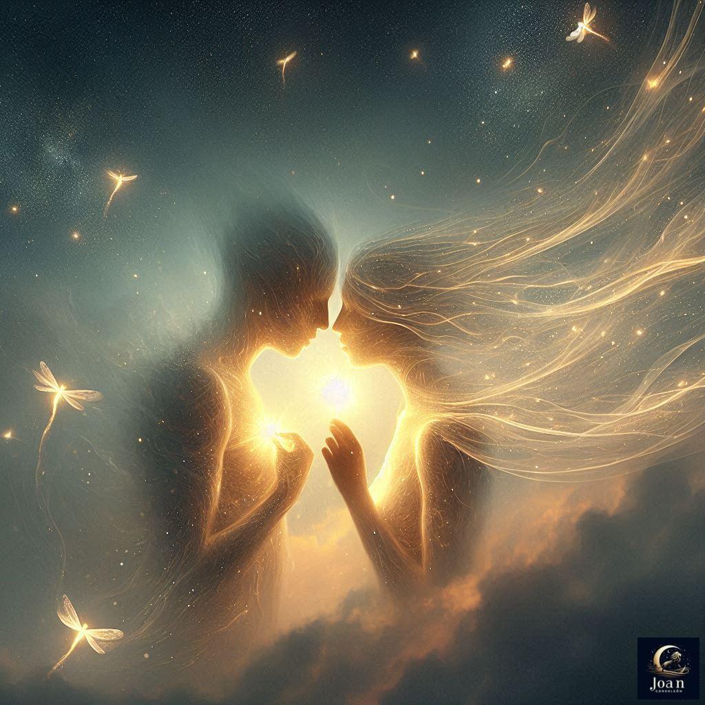 «Una escena poética de dos almas entrelazadas en un entorno onírico: una figura sopla luces de luciérnagas hacia el pecho de la otra, iluminando el espacio con un brillo cálido. El fondo es un cielo suave, entre el anochecer y el amanecer, lleno de estrellas tenues. Sus cuerpos no son completamente humanos, sino etéreos, como hechos de viento y luz. La imagen debe transmitir intimidad, silencio compartido y un amor profundo que flota entre lo real y lo soñado.»