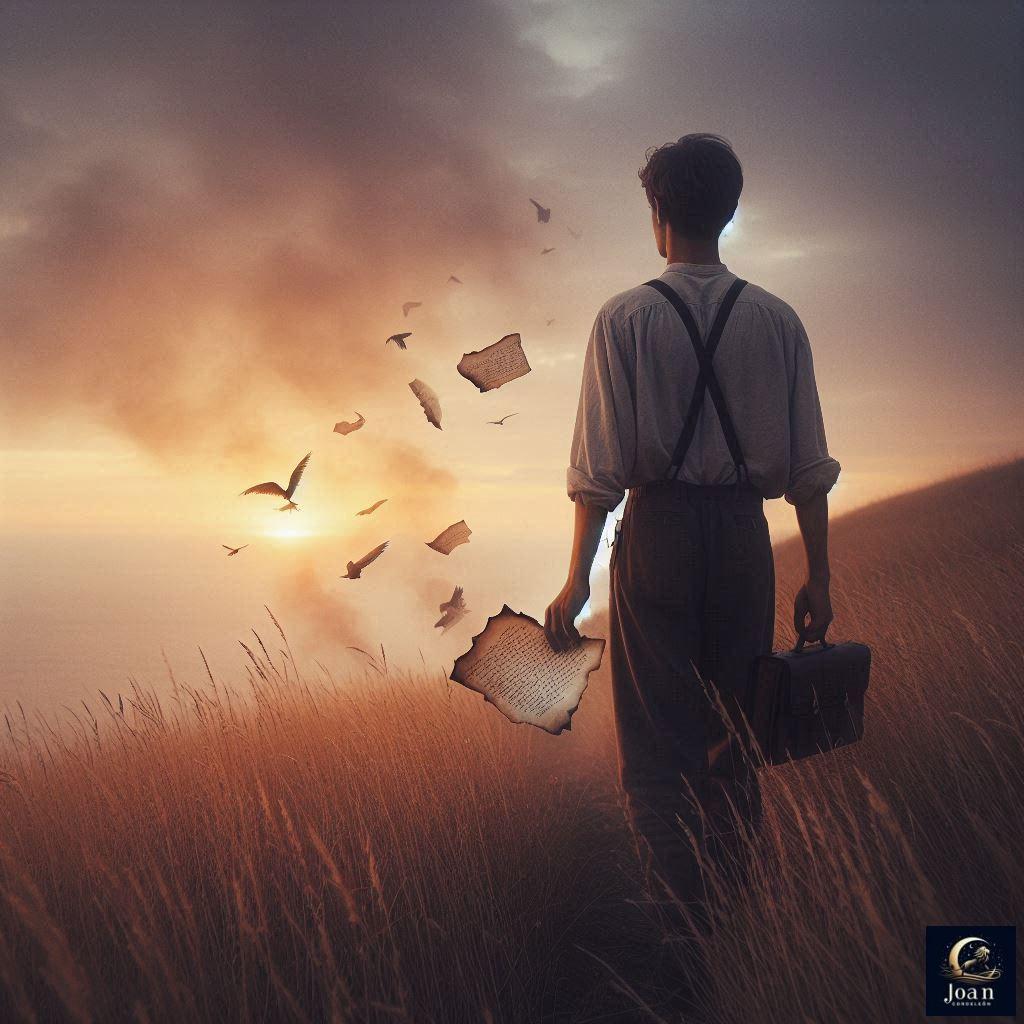 Una figura solitaria de espaldas, vestida con ropa sencilla, parada al borde de un acantilado suave cubierto de hierba dorada por el atardecer. En su mano izquierda sostiene un papel doblado y quemado en los bordes, del que escapan letras escritas a mano que vuelan como pequeñas aves hacia el horizonte. Al fondo, el cielo se tiñe de tonos anaranjados y violetas, mientras una ligera nube con forma de nombre humano parece flotar entre las alturas, casi invisible pero presente. Estilo: Fotografía cinematográfica con suaves efectos surrealistas y colores emotivos.
