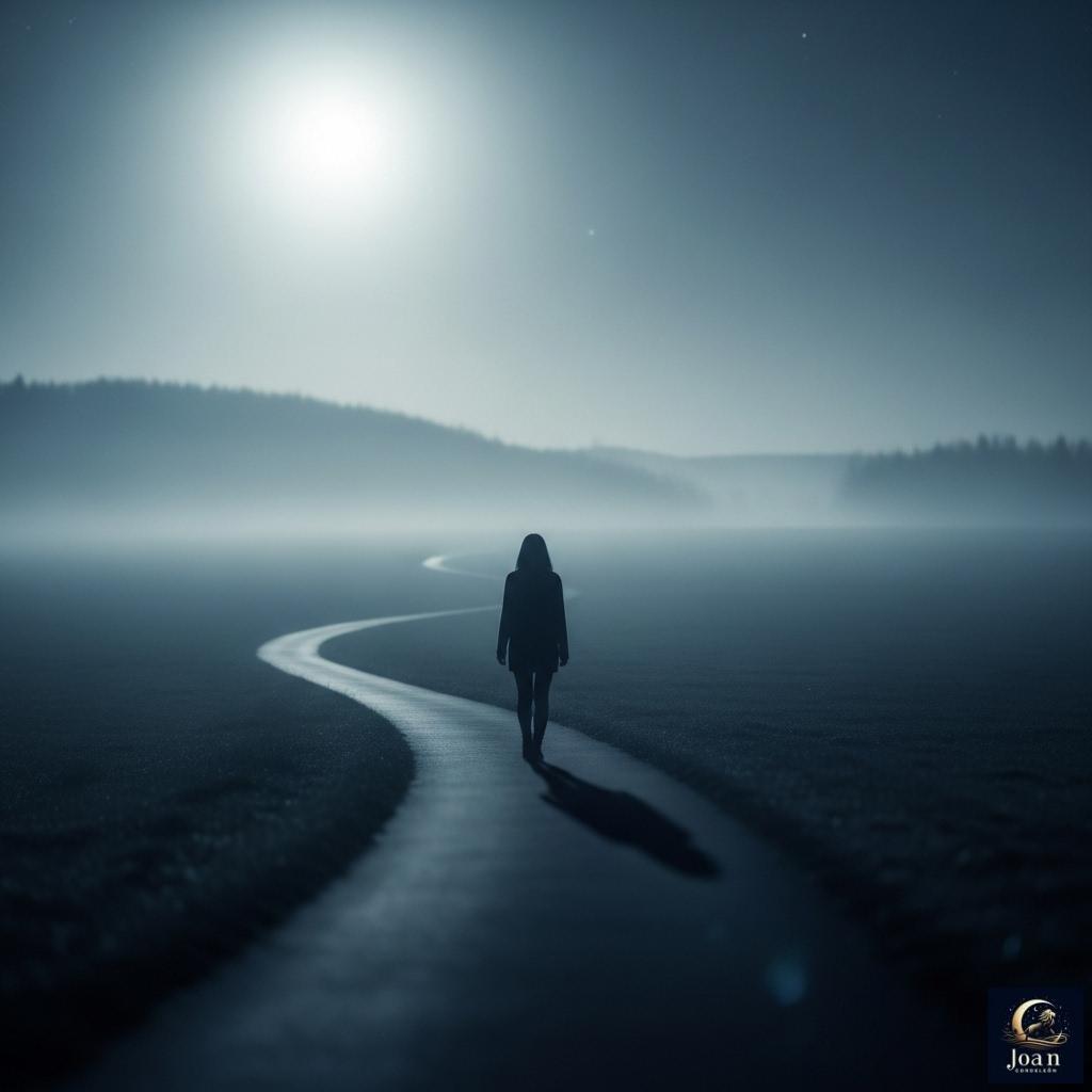 «Un paisaje nocturno envuelto en niebla, donde una figura solitaria camina por un camino desdibujado. La luz de la luna ilumina su silueta con un resplandor tenue, mientras sombras difusas y borrosas parecen seguirle, como si fueran ecos de memorias perdidas. La atmósfera es melancólica pero etérea, con detalles sutiles que sugieren un equilibrio entre la tristeza y una suave esperanza.»