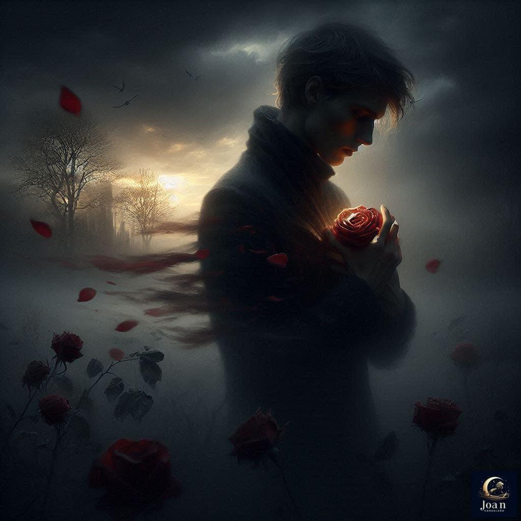 Crea una imagen poética y melancólica de una figura andrógina caminando sola por un jardín oscuro y nebuloso. En sus manos sostiene una rosa roja brillante que parece arder suavemente, iluminando su rostro con una tenue luz carmesí. Alrededor, las sombras de rosas marchitas se desvanecen en la niebla. El cielo es gris profundo, con trazos de luz dorada que sugieren esperanza al horizonte. La expresión de la figura transmite melancolía y fuerza contenida, mientras el viento arrastra pétalos por el aire como susurros de un amor perdido.