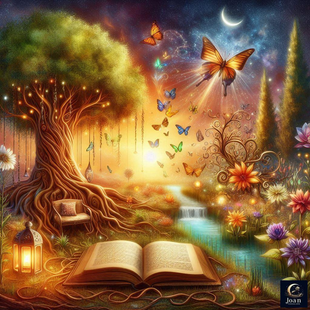 - Un jardín exuberante, con flores que parecen susurrar y árboles cuyas hojas son páginas de libros abiertos.