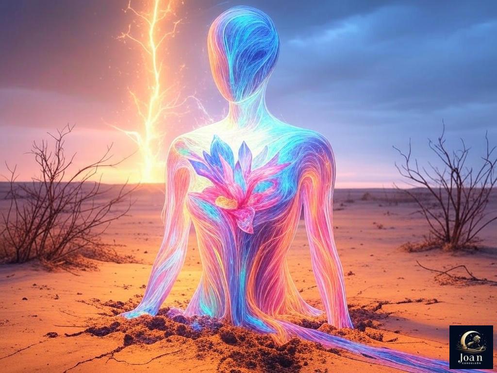 Pintura digital surrealista y etérea. Un paisaje interior desértico y melancólico, con ramas secas y suelo agrietado bajo un cielo crepuscular. En el centro, una figura abstracta, sin género definido, hecha de luz tenue o energía, comienza a florecer con colores vibrantes e inesperados (quizás como flores de cristal o luz sólida) desde su pecho o corazón. Una fisura luminosa en el cielo, como un sol emergiendo de una tormenta, baña una parte de la escena con una luz dorada y esperanzadora, contrastando con la penumbra circundante. La imagen debe evocar una transformación interna, la belleza surgiendo de la desolación, y una conexión profunda y simbólica. Sin rostros detallados, enfocarse en la luz, la textura y la emoción.