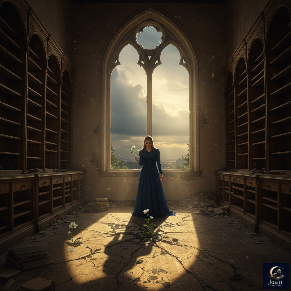 “Una figura andrógina de pie en una biblioteca en ruinas, sosteniendo una flor que brota entre las grietas del suelo. La escena está iluminada por una luz suave al atardecer que entra por una ventana rota. Afuera, se vislumbra un cielo nublado con un tenue rayo de sol atravesando las nubes. La atmósfera transmite melancolía, pérdida y una serena esperanza.”