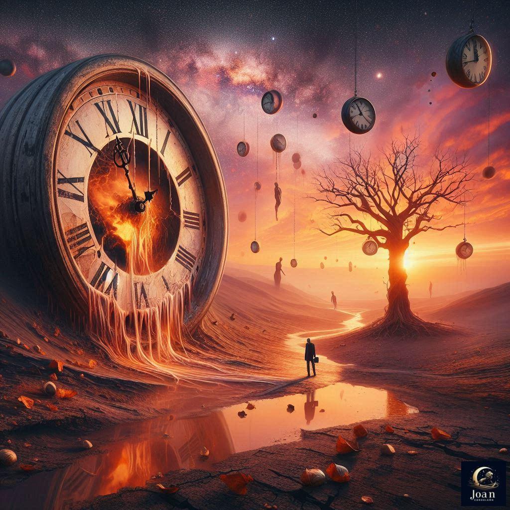 «Crea una imagen surrealista que capture la esencia del soneto ‘El Reloj de la Eternidad’. La escena debe mostrar un reloj antiguo y gigante en medio de un paisaje desolado, con sus manecillas derritiéndose como si fueran de cera. Alrededor del reloj, hojas secas caen al suelo, simbolizando el paso del tiempo. El cielo es un atardecer dramático, con tonos naranjas, rosados y morados, y las estrellas comienzan a aparecer. En el fondo, un árbol sin hojas se alza contra el horizonte, y en sus ramas cuelgan relojes más pequeños. Incluye detalles surrealistas, como sombras de figuras humanas que se desvanecen y un espejo en el suelo que refleja un cielo diferente. El estilo artístico debe ser surrealismo onírico, con texturas ricas y una atmósfera melancólica pero mágica.»
