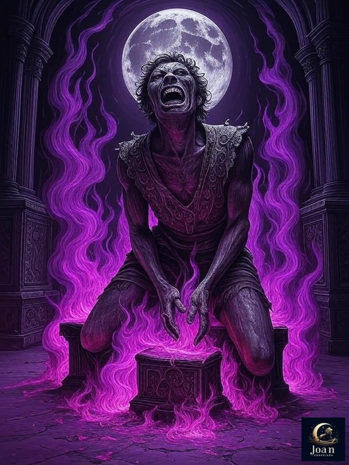 «Ilustración psicodélica oscura. Figura humana arrodillada en llamas púrpura, con rostro distorsionado por placer y rabia, frente a un altar gótico bajo una luna negra descomunal. Trazos caóticos y líneas como cuchilladas. Estética entre el delirio y la ceremonia. Influencias visuales: H. R. Giger + Gustave Doré + arte digital sacrílego. Paleta: rojo infernal, púrpura ácido, negro absoluto y blanco hueso.»