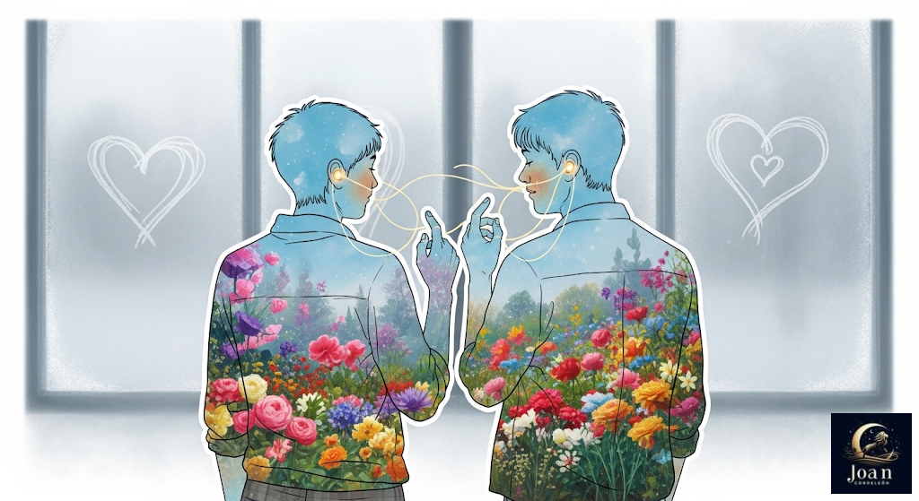 «Dos figuras translúcidas de espaldas, vestidas con ropa común pero con jardines floreciendo bajo sus prendas (visible en sección transparente). Entre ellas, hilos de luz conectan puntos estratégicos: orejas, yemas de los dedos, labios. Fondo invernal con ventanas empañadas donde se dibujan símbolos amorosos. Estilo: ilustración digital con técnica mixta (acuarela para los jardines, líneas vectoriales para los hilos), paleta de azules pálidos y grises con explosiones de color en las flores internas.»