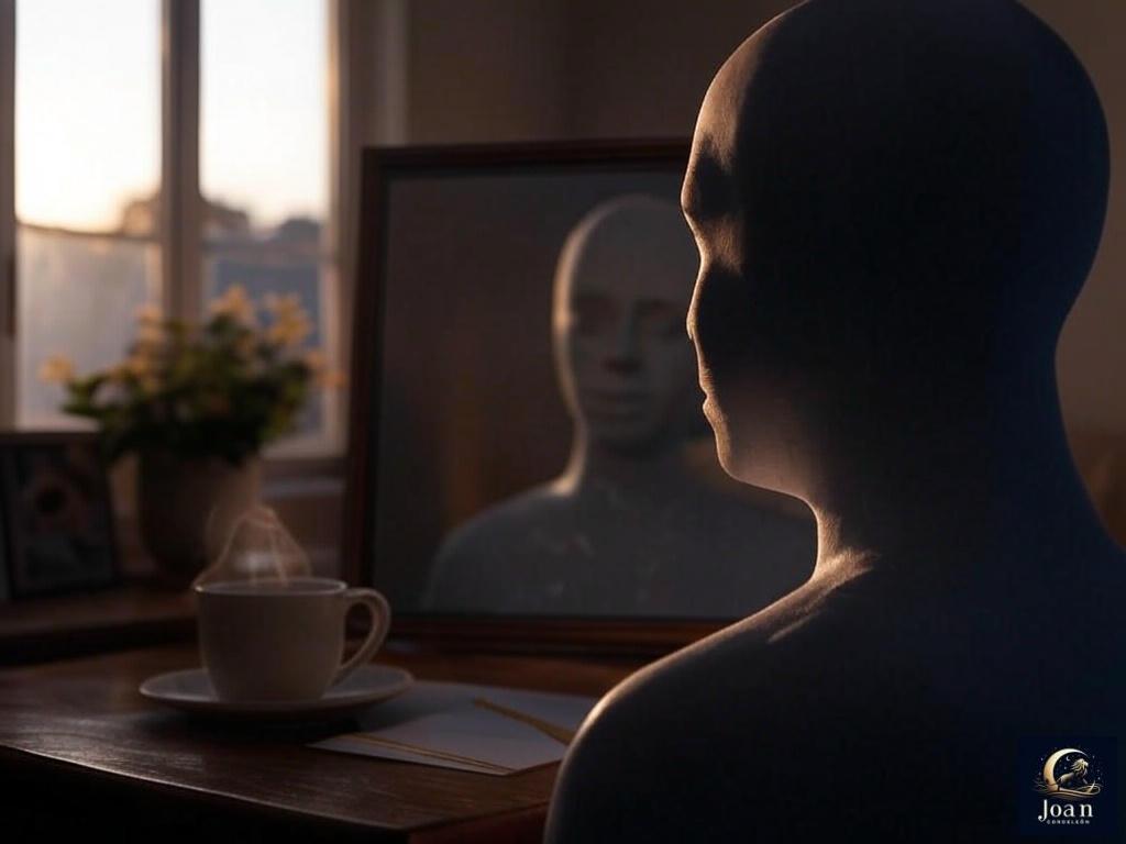 Una figura solitaria de género indefinido camina por una habitación semioscura, iluminada por la luz tenue del atardecer que entra por una ventana abierta. Hay una taza humeante sobre una mesa, y un espejo empañado refleja el contorno del rostro, difuso. El ambiente transmite pérdida y quietud, pero hay detalles sutiles de esperanza: una planta floreciendo en una esquina, una carta abierta con líneas doradas, una luz cálida filtrándose suavemente. El estilo debe ser poético y melancólico, con colores suaves y una atmósfera emocionalmente envolvente.