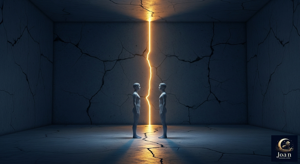 Fotografía conceptual y emotiva, estilo cinematográfico. Dos siluetas andróginas, casi espectrales, se encuentran en una habitación grande y vacía con paredes de hormigón agrietado. No se tocan, pero están de pie, una frente a la otra, conectadas por una tensión palpable. El ambiente es melancólico y minimalista. La única fuente de luz es una delgada grieta vertical en la pared del fondo, de la cual emana un intenso y cálido resplandor dorado que ilumina sutilmente los contornos de las figuras y proyecta largas sombras en el suelo. La paleta de colores es de azules profundos y grises fríos, en dramático contraste con la luz dorada y esperanzadora de la grieta. La imagen debe evocar una sensación de anhelo, intimidad profunda y una esperanza silenciosa en medio de la desolación. Alta definición, fotorrealista, atmósfera etérea.