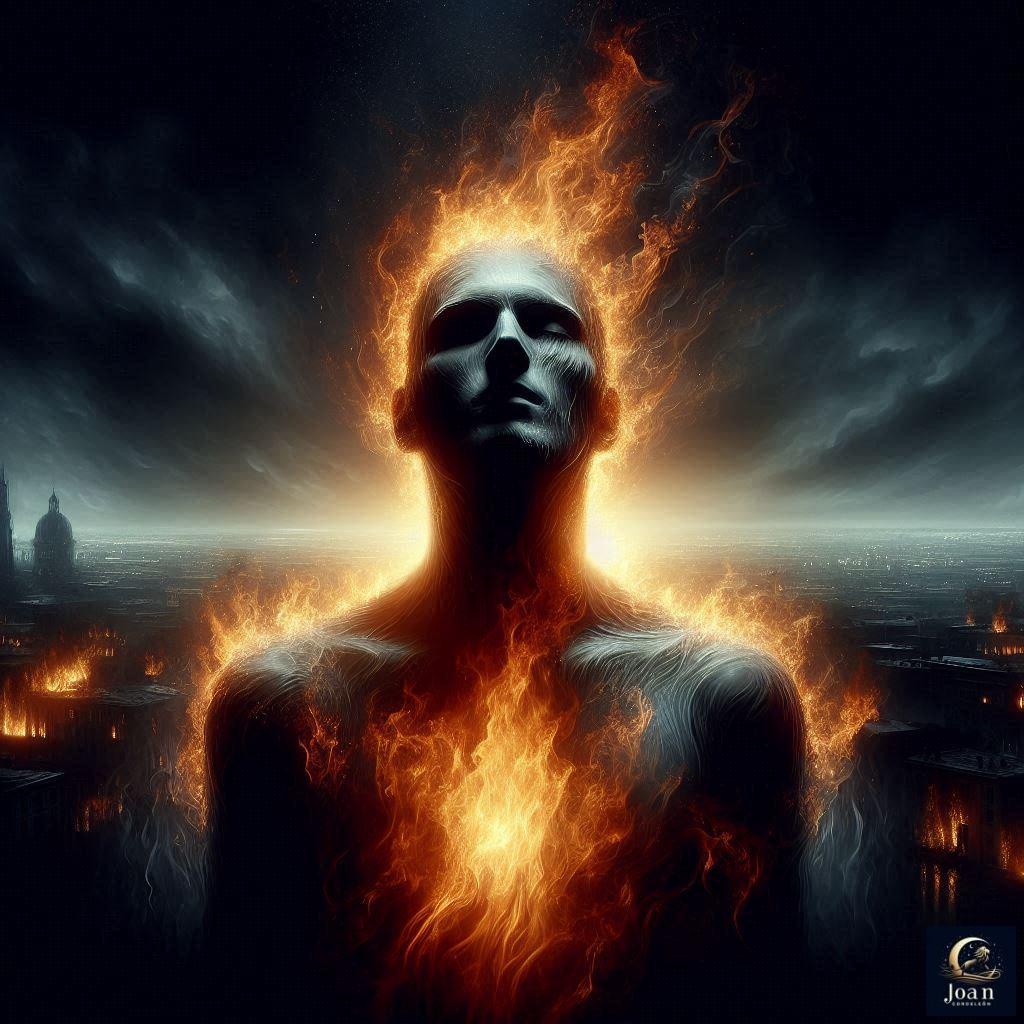 «Create a surreal image: a human figure enveloped in flames, but without feeling pain, surrounded by a darkness that gradually dissipates. The figure must have an expression of peace and serenity, as if in a state of ecstasy. In the background, a dark and desolate city, but with a faint light filtering through the windows. The image must convey a sense of passion and desire, but also of peace and tranquility.»
