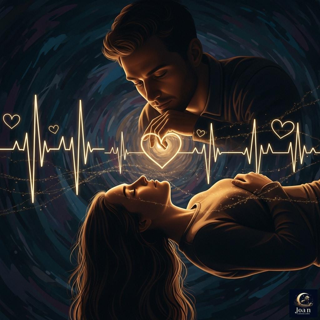 Una escena íntima y simbólica en tonos oscuros con iluminación cálida: dos siluetas entrelazadas en un entorno onírico, donde la gravedad parece invertida y una figura está “abajo”, tendida con los ojos cerrados, envuelta en una atmósfera de entrega serena. Desde arriba, otra figura le observa con ternura intensa, como si contemplara una obra de arte viviente. Alrededor, latidos dibujados como ondas de luz recorren el aire, conectando ambos cuerpos. El fondo debe ser abstracto, evocando emociones más que lugares reales, con una atmósfera entre melancólica y ardiente, simbolizando la pasión, la elección y la entrega.
