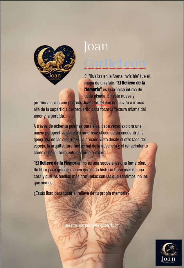 «El Relieve de la Memoria» es una audaz excavación arqueológica del corazón. No se conforma con ver la huella, sino que se arrodilla para sentir su textura, su profundidad y la perspectiva oculta en cada marca. Es una colección de crónicas poéticas que exploran la otra cara del amor: la del que hiere, la del que se queda, la del que renace al aceptarse.