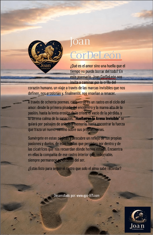 «Huellas en la Arena Invisible» es un viaje poético a través del mapa emocional que el amor traza en nuestra alma. Es una exploración del ciclo completo de una relación en cinco actos: la primera pisada del encuentro, el rastro profundo de la pasión, la erosión de la crisis, el vacío de la pérdida y la nueva senda de la sanación.