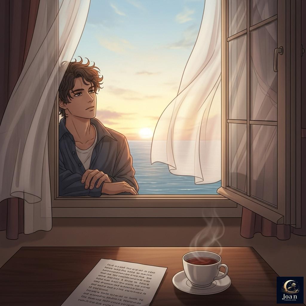Un atardecer dorado visto desde una ventana abierta, con una figura solitaria apoyada en el marco, mirando hacia el horizonte con expresión reflexiva. A lo lejos, el mar se funde con el cielo, y el viento mueve sutilmente unas cortinas semitransparentes. En la mesa cercana, una hoja de papel con palabras a medio escribir y una taza de té humeante. La atmósfera debe ser cálida y nostálgica, con tonos melancólicos pero llenos de luz suave, simbolizando el amor contenido y la esperanza silenciosa.