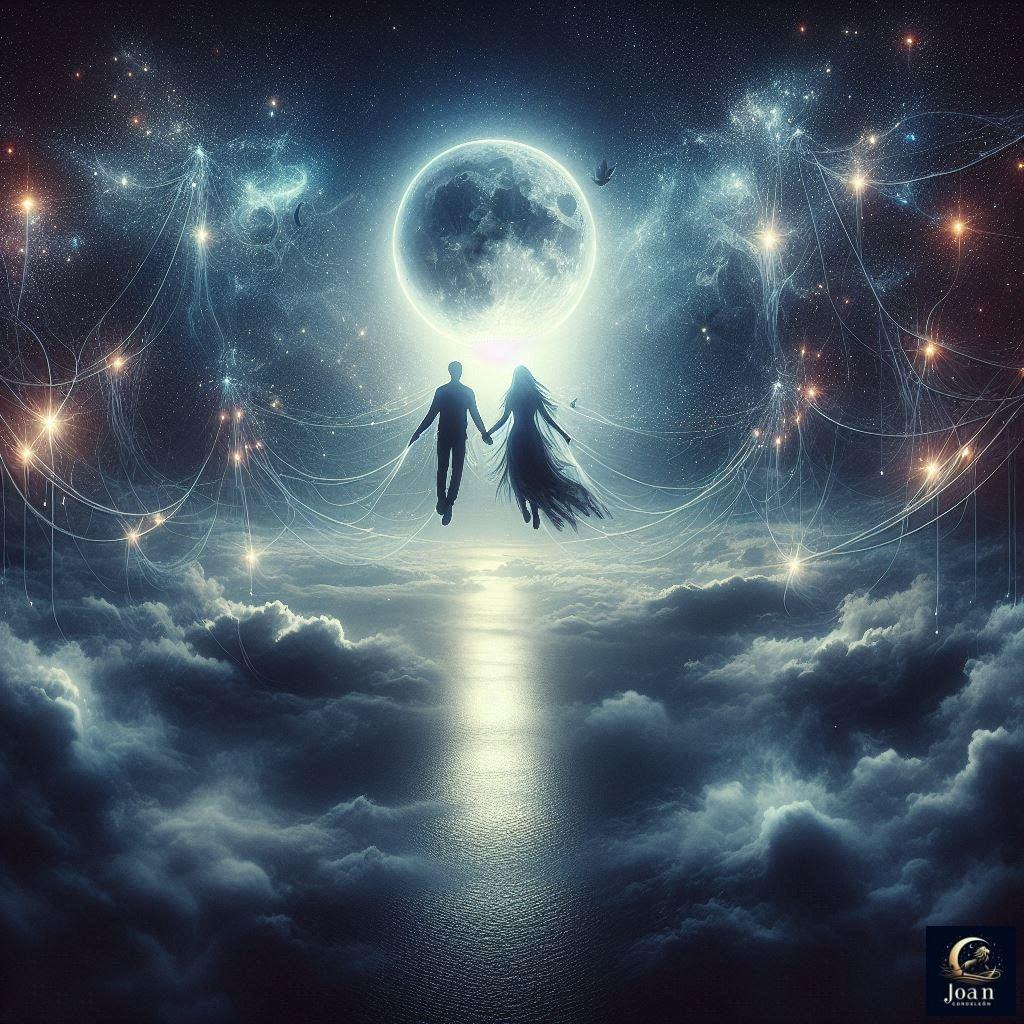 «Crea una imagen evocadora de dos siluetas flotando en el aire bajo una luna inmensa, rodeados de un cielo estrellado y brumas etéreas. Sus formas parecen entrelazarse con hilos de luz plateada, como si gravitaran en una danza silenciosa. La escena transmite una sensación de amor cósmico y atemporal, con un océano lejano reflejando la luna y el resplandor de las estrellas. La atmósfera es mística y onírica, combinando melancolía y belleza en una imagen etérea.»