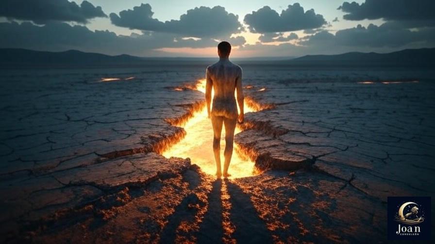 A cinematic, hyper-realistic image with a painterly feel. An androgynous figure, seen from the back, stands in the center of a vast, desolate landscape of cracked, grey earth, reminiscent of a dry lakebed under a twilight sky with dramatic, melancholic clouds. From a large, glowing fissure in the ground before them, a warm, soft, golden light emanates, illuminating the figure and casting long, gentle shadows. This light is the only source of warmth and color in the scene, symbolizing a profound and burgeoning hope within the desolation. The atmosphere is ethereal, contemplative, and intensely emotional. 8K resolution, dramatic lighting, epic scale.