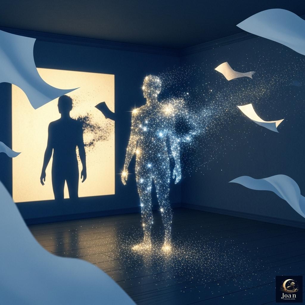 «Crea una ilustración onírica en tonos azules y dorados, donde una silueta humana hecha de estrellas se desvanece en el aire, dejando atrás un rastro de polvo luminoso. Al fondo, una pared con la sombra proyectada de alguien que ya no está, mientras el viento mueve sábanas blancas flotando en un cuarto vacío. La atmósfera debe transmitir nostalgia, pero también una belleza etérea y serena.»
