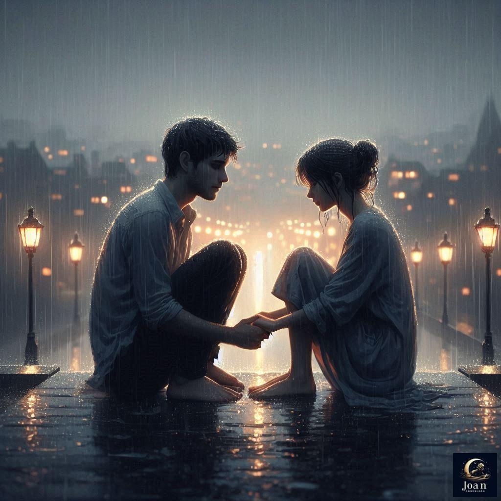 Una pareja sentada bajo la lluvia suave, sin paraguas, tocándose las manos con ternura, como si compartieran una promesa silenciosa. El fondo muestra un paisaje urbano gris y melancólico, pero con pequeñas luces cálidas encendidas en la distancia, como faroles o ventanas. La escena debe transmitir vulnerabilidad, esperanza y conexión íntima. El rostro de uno debe mirar al otro con calma, no con pasión, sino con una ternura contenida, mientras las gotas de agua caen suavemente sobre sus cabellos. El tono debe ser poético, nostálgico y sereno.