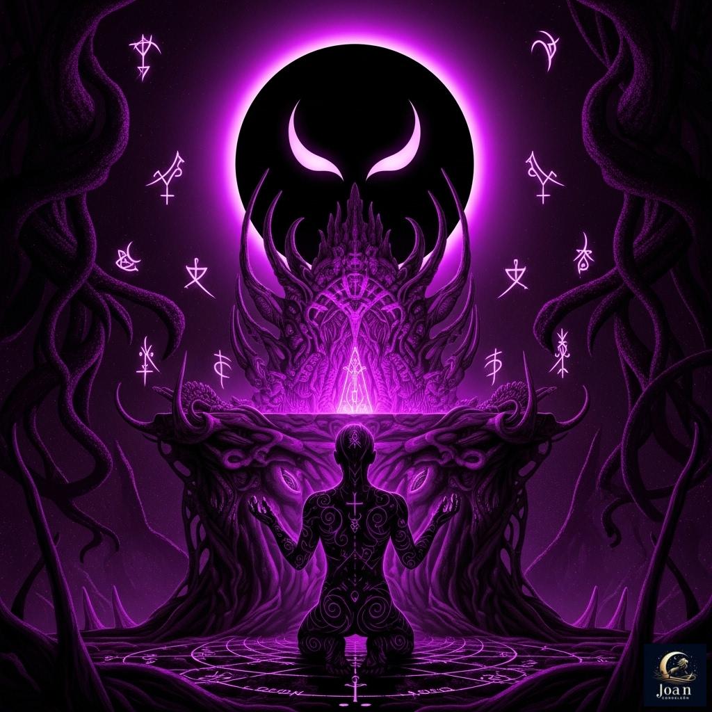 «Obra digital estilo Dave McKean fusionado con H.R. Giger. Figura andrógina arrodillada frente a un altar orgánico, la luna negra suspendida sobre su espalda como una aureola corrupta. Texturas viscosas, símbolos esotéricos, luz neón púrpura y sombras profundas. Paleta: negro tinta, magenta sacrílego, óxido violáceo.»