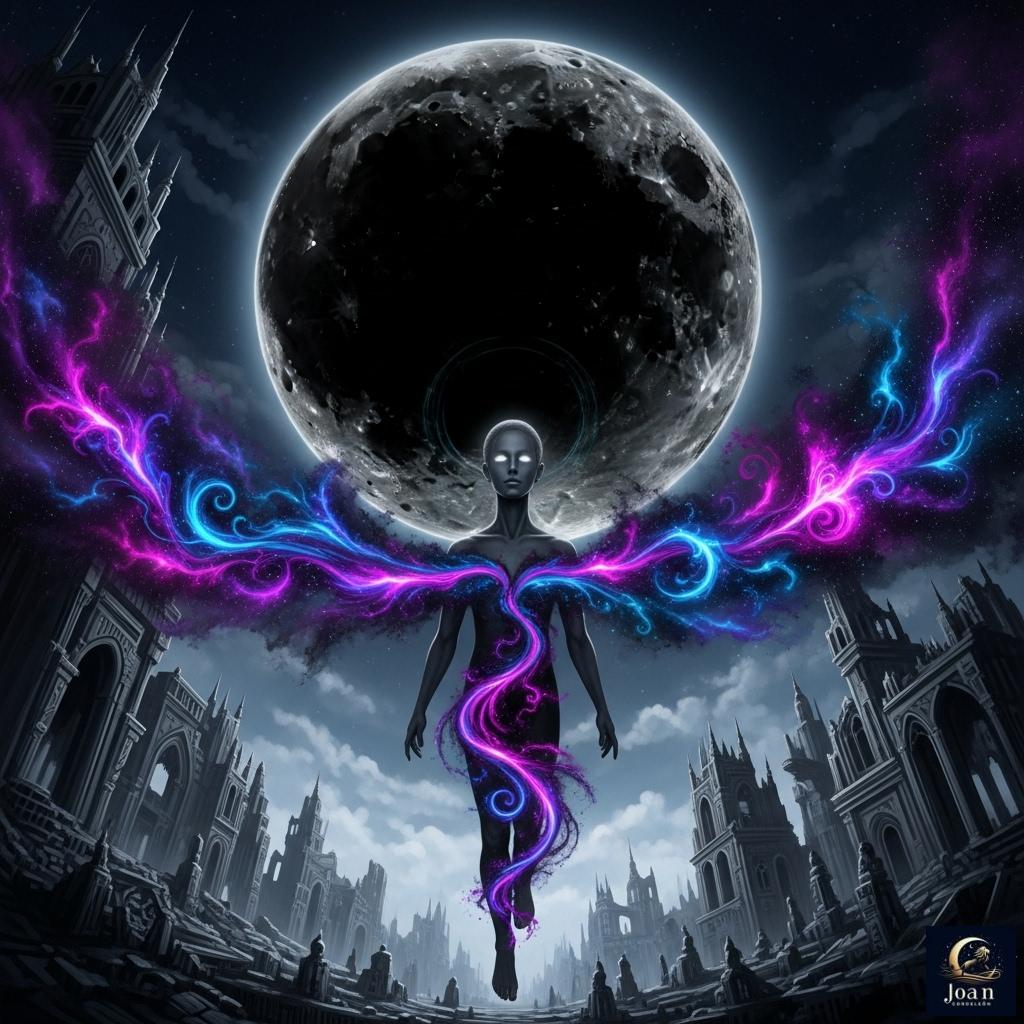 «Digital painting, estilo psicodelia gótica. Una figura andrógina con los ojos en blanco, levitando ante una inmensa luna negra que llena el cielo. Remolinos de energía cromática (violetas, azules profundos, toques de fucsia eléctrico) emanan de la figura y la luna, fusionándose. La arquitectura del fondo es vagamente gótica, ruinosa, distorsionada como en un sueño. Inspiración: Zdzisław Beksiński conoce a Alex Grey. Paleta: negro obsidiana, violeta episcopal, azul de medianoche, fucsia eléctrico, plata.»