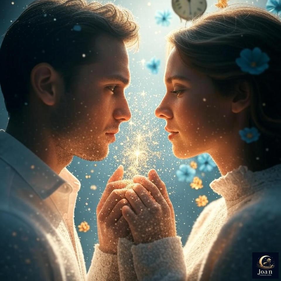 Una escena onírica y simbólica de dos siluetas humanas (de género neutro) frente a frente, envueltas en un resplandor suave que surge entre ellas como una chispa luminosa. El fondo es atemporal: un paisaje etéreo que mezcla cielo estrellado, relojes derritiéndose como en los sueños, y elementos que evocan el tiempo detenido (flores flotando, arena suspendida en el aire). La expresión en sus rostros transmite intensidad emocional, reconocimiento y nostalgia. Estilo artístico: poético, melancólico, luz suave, detalles difuminados, tonos azules y dorados.